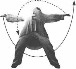 ①接上势,身体重心稍上升,上体保持水平,向右翻转至仰身 向上。两腿伸膝站立,膝微屈。同时,两臂随身体水平翻转向右立 圆抡摆。随身转动摆头。(图6-89)