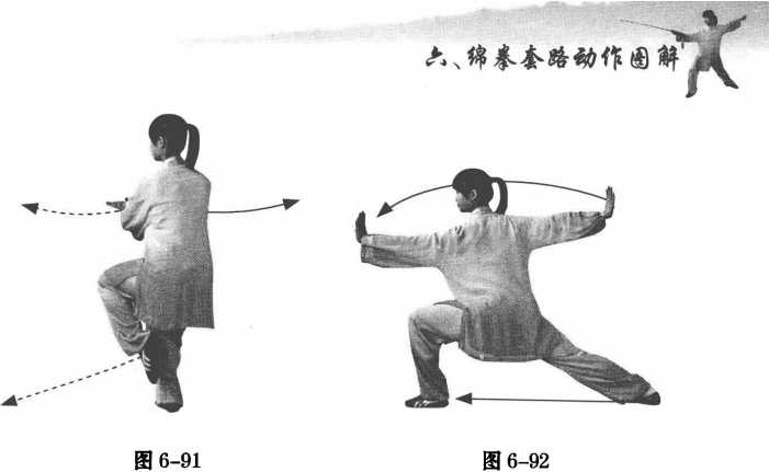 身体重心上升,上体直立稍左转。左脚蹬地后屈膝提起向左侧 前方上步,左腿屈膝前弓,右腿伸膝蹬直,成左弓步。同时,右手 下落,两臂胸前交叉,两手经腹前向左右分摆至同肩高时沉腕、挑 掌。头向左摆,目视左前方。(图6-91、图6-92)