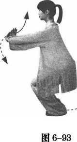 ①接上势,重心前移@右脚收起向左脚并步靠拢,两腿屈膝半 蹲。同时,右手从后向上、向前摆动至胸前和左手交叉,两掌心向 外,指尖向上,成十字掌,左手在外,右手在内。目视前方。(图 6-93)