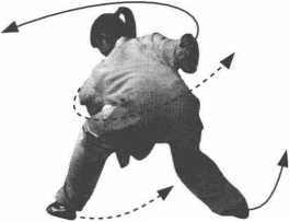 ②身体向左后转身,上体前俯。左脚向右后方撤步,右脚以前 脚掌为轴拧转,脚尖内扣,重心移至左腿。同时,两臂随转身自然 平摆。(图6-104)