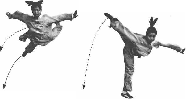 ③重心上升,身体向左后上方甩动,两臂随身体平摆至身体两 侧自然分展;左脚蹬地腾空,右腿随上体甩动向左上方摆起,左腿 随即依次向左上方摆动,身体在空中平旋一周。右脚落地,右腿屈 膝缓冲支撑。(图6-105、图6-106)
