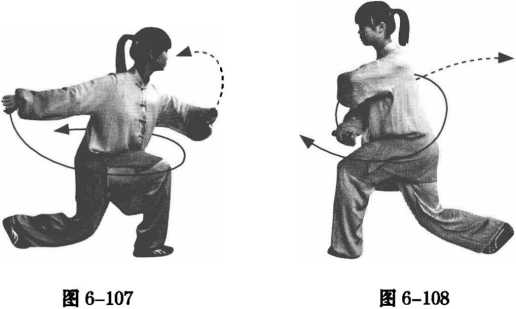 ①身体重心下落,上体微向右转。左脚在右脚后落地,两腿屈 膝半蹲。同时,两臂随身体平摆。(图6-107)