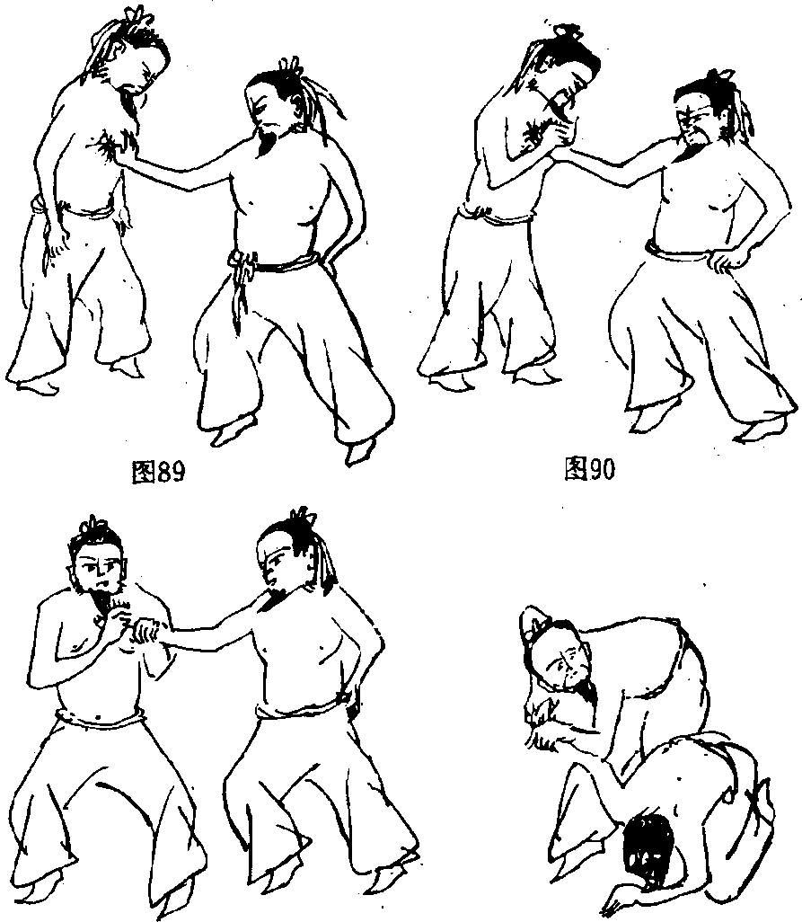 1 敌用右手摸点我膻中穴。(图89)2 我应立即用右手紧抓敌之右手(图90)3同时我用左手用力压住敌手腕。(图91)4接着我身体猛向右转切扣敌手腕。如敌力量较大可用左肘关节猛压改右小臂和肘部使其反肘,(反关节)可造成敌手腕或肘部受伤。(图92)要领1双手抓握敌手腕要紧,用转身、掌跟扣腕之合力猛挫敌腕2切敌腕要及时压敌肘要有力