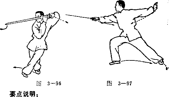 (一)身动剑动,碾地有力。腿 动身拧,拧腰发力。以身带臂,以臂 图3-95 带剑。做到动作沉实稳健,腰活足 扣,上下一致,连贯协调。