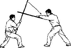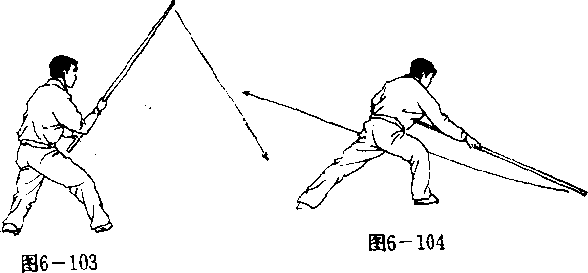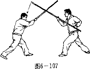 【用法】撇打为粘格 反击棍法。如敌持械向我 上部袭来,我先以棍粘格 敌械,迅即顺势下打敌 手,使其械脱落,(图6— 105),此即“千金难买 一响: