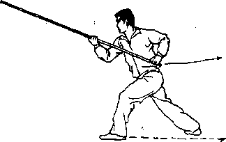 (2)上动不停,右脚上步成右弓步;同时双手持棍随 上步之势使棍梢由右上向前下扫击(图6—)。