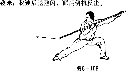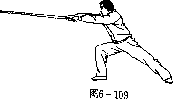 势向前直臂戮击,左手心朝下,右手心朝上,两虎口均向 前,棍梢高与胸齐。目视前方(图6—109)°