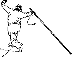 上动不停,右脚上步成右弓步『同时双手持棍,右腕外旋, 左手沿棍身向右手处滑握,使棍梢由左经上向右前方下劈,棍 梢着地,两手心相对,虎口均向前.目视棍梢(图6—169).