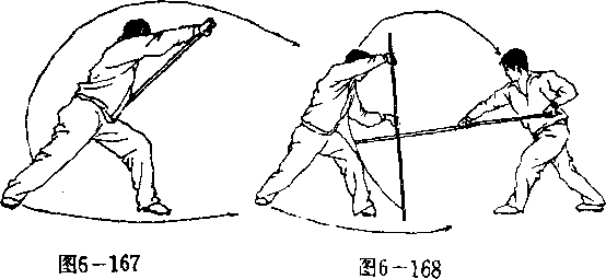 【用法】敌袭我下其上必空,我下挂后速抢步进身翻劈 敌头(图6—1 70 ).