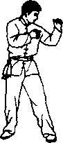 ①侧身对敌,两脚自然开立与肩宽,右手护于左肩侧, 左臂弯屈成直角,手指微屈成半握拳状,与鼻同高,手心向 右,沉肩坠肘,两眼逼视敌目.(图7—6)