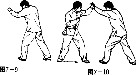 ②我左脚先向正前方擦地滑进,同时以左掌背粘靠敌方 手腕,(图7—1。)