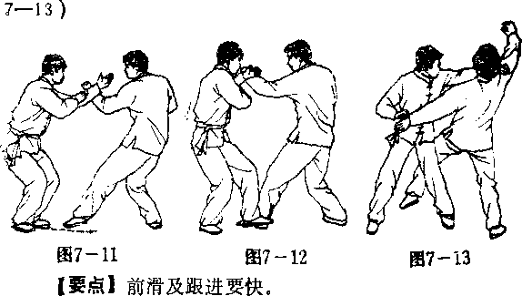 ③动作不停,右脚迅即向前跟进,同时以左掌向左外侧 格压敌腕。(图7—11 )