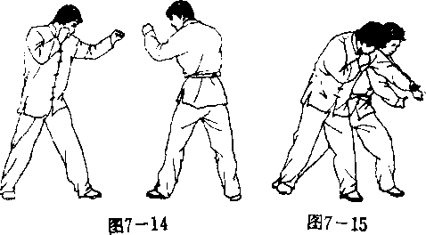 ②敌如以前手向我袭来,我可乘势粘擒其腕,迅即拧腰 进身,以右脚由敌身后封住敌双腿(图7—15),速即重心