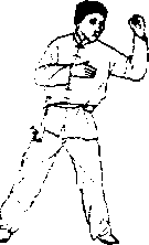 【要点】肩臂及腰身的拧转要松活快速,步子的挪动要 快,作弧形擦地而行。此步为左右圈缠步,还可做右左圈缠 步,即挪右脚上左步,如此往复不断.久练则身灵步活,眼 明手快。