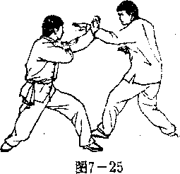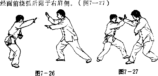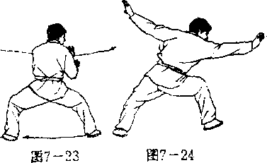①由中守势(图7—22)「上体突然向左拧转,左脚障 转体之势向后挪步;两掌交叉于腕前。(图7—23)