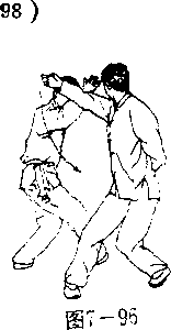 注意;到此时二人位置已互换,下面动作应从第一势 (即图2—95)开始衔接,唯动作相反.做时应将重心右移 成右弓步,左膝内扣关裆,左肩右裹,以左小臂在腹前靠. 击,其余动作以此类推,恕不一一赘述。