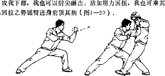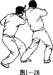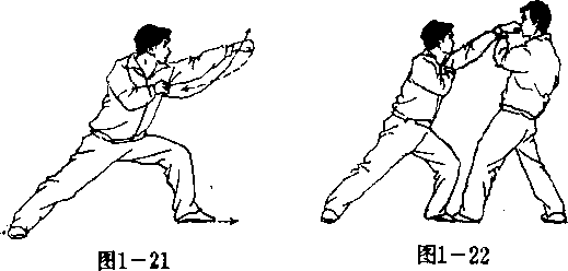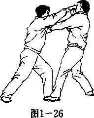 【用法】我靠击敌臂敌必坠肘回挣,我则乘其回挣之势 猛击其面(图1一26)。