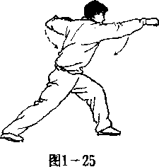 接上势,右拳猛然前冲,拳心向下,高与肩平;左臂随 前冲之势屈臂回收(图1—25)。