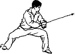 图1一33图1一33接上势,上体前移成马 步;同时,左掌内翻变拳,拳 心向下;右拳由右后向前压于 左腕上(图1—32)。