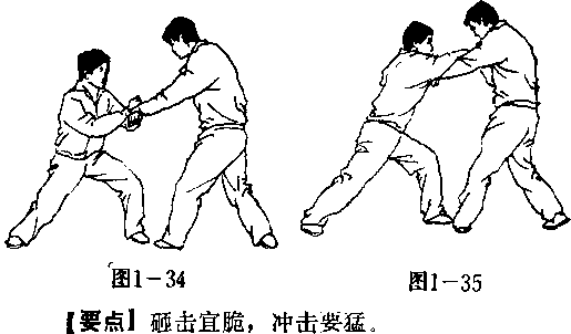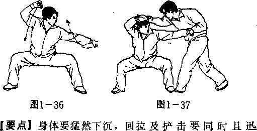 【用法】我冲击敌胸,敌如格抓,我则就势采拿回拉* 迅即以左拳猛击敌腹(图1-37 )。