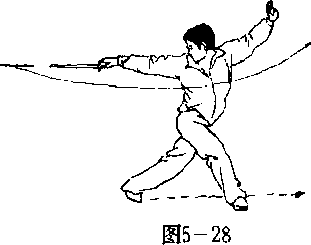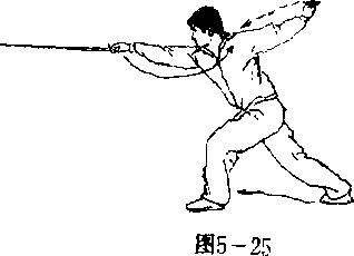 上动不停左脚向左前方上步成左弓步迅即腰身左拧同时右手持剑随上步之势向前直臀剌出,手心向下剑身横平与肩同高左手随前刺之势向左后分开目槐正前方(图5—25)