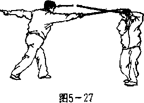 用法剃剑为粘格进击之剑法敌持械问我迎面剌来我速闪揶避化同时坠肘带剑剃格敌桩(图5-27)