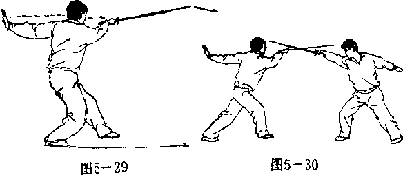 用法侧剁为连砍带格之剑法如敌械由我身后菱来我速拧腰右闪同肘择剑格击敌械或砍击敌头(图—30) 一亍