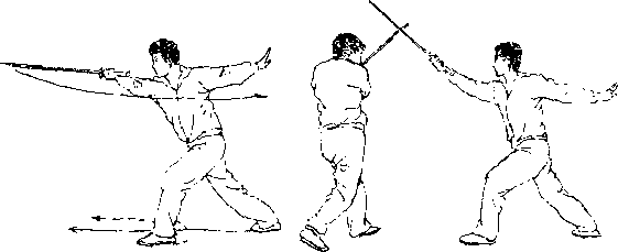 上劫不停右唧向前上步腰身左拧左脚随拧转之势向左后挪移同时右手持剑前伸手心向上随拧转之势平行移动目随右剑(图
