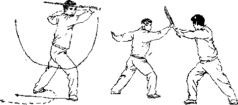 (1) 接上势左脚向前落去迅即右脚上步同时右手持剑右腕外旋上翻使剑尖由下向右上翻转(图—口),