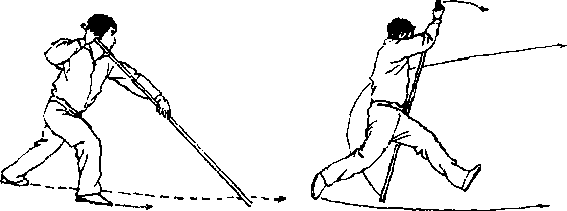 (2) 上动不停左手换握棍把成虎口朝下双手用力撑握棍身速即左脚由棍右侧上步右脚随左上之势向前滑进(图6—24)