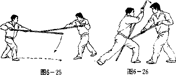 用法探筒为粘接进身之法我成待敌势如敌持械向我正面袭来我速以棍把盖压敌械(图6-25),速即抢一步进身以棍梢盖击敌面(图一抨)撑篙还有另一妙用