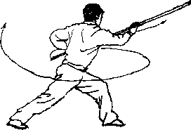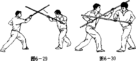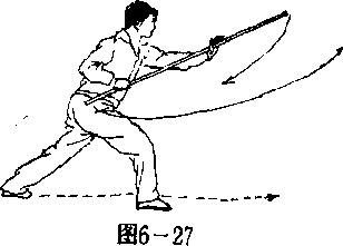 (1) 接上势左髀前上一步休右转同时双一手持棍右手上提左手前抛使棍把由左上向前下盖压两手心向下虎口均向上(图6—23)『