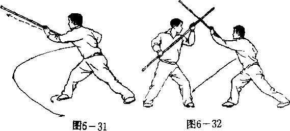 内左手松握棍身随转怵之势使棍梢由左下向吉上方推扪手心向右目视正前方(图6-31)