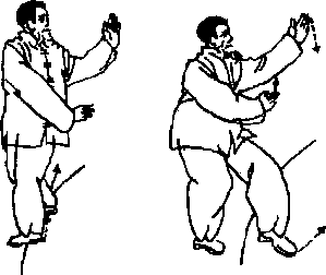 右足上步至左足旁似停非停右掌自左肘下穿出左掌抽回于右掌后右掌心向左左掌心向右眼视右掌(图1-6-4九承上势右足立即向前方斜上左足跟步带同身体催助臂力双撞掌,两掌十指向上以小鱼际肌撞击。以上三动一气相承不要有停滞现象(图1一6—5左足回身向左出步左搂手,眼随左手注视(图1一6—6