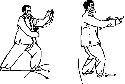 左式单换掌走至左足在前(图1—6一1九右足横出步,左足跟步成右实左虚步手不动(图1-6-)左足斜出,左手略向左搬眼仍注视左手(图1一—3)