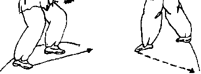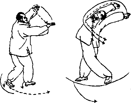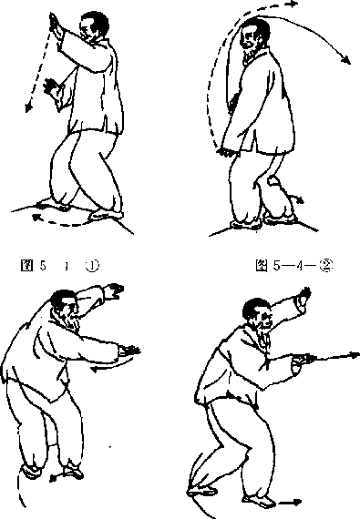 4— 5九右踵转身后仰双膺随身动翳于上眼视双臂左斓身左足后扫成马步,双臂随身动经头上摔于胯下叫转身背包眼随双臂转移视线(图5—4一6、图5—4一7儿