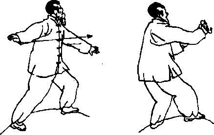 腰带动身躯左旋后移身躯带同右臂经左成一半圆形上臂收至胸前同时左臂覆掌探出眼前视(图5—4一4九承上势右臂仰掌迅速探出左臂回收于右肘上眼视右掌(图5-