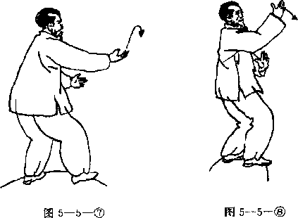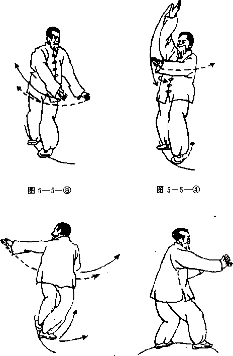 、左式走掌,走至右足在前图5—5一1九左足上孝左手仰掌经额下向上抄手右手仰掌随着上举,眼上视双手(图5— 5一2工步不动左腕内旋握拳双臂同时向左下带眼向下视(图5—5一3九图5—5—图5—52接着右臂上抬反仰掌举于头上左臂向斜上迎击喉部,眼视左手(图5—5一4久左足后出步回身虚点成右实左虚步左臂自右向下弧形反削一半圆形至左右臂下垂眼视左臂(图5—5一5重心落实左足右足上步右手平穿掌眼视右手(图一6九图55―5图5—5-()两腕外旋成仰掌(图5—5—7)换掌成右式(图5-5-8、图5一5——9)图5—吒一9