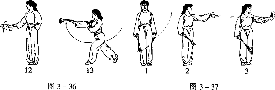 向下,高与肩平,右手扇顶微向里扣。目视左手前方(图3 - 37 - 2)o