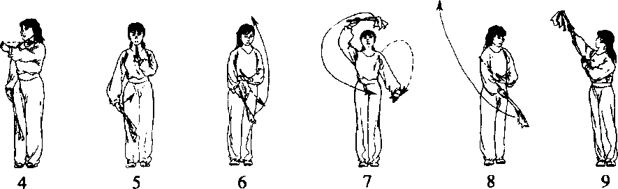 (4)上体右转45。,同时右手向右侧上方摆起,扇顶朝上,左手 随右转身附于右扇前。两脚跟提起,目视右手(图3-38-9)。