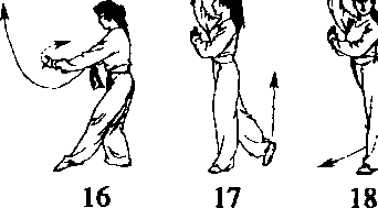 (1)右脚尖内扣,重心移至右腿,身体向左后转180。,同时左 脚尖外摆至左斜前方45。落步。两手随转体向左平行摆动至体右 前,眼随视右手(图3-42-30)o