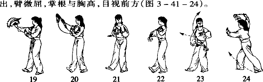 (5)两脚不动,身体微向左转。同时扇顶经腹前向左穿至左 腹前,手心朝上;左前臂内旋屈肘抱于左胸前,手心朝下,与右扇相 对,目视右手(图3-41 -23)o