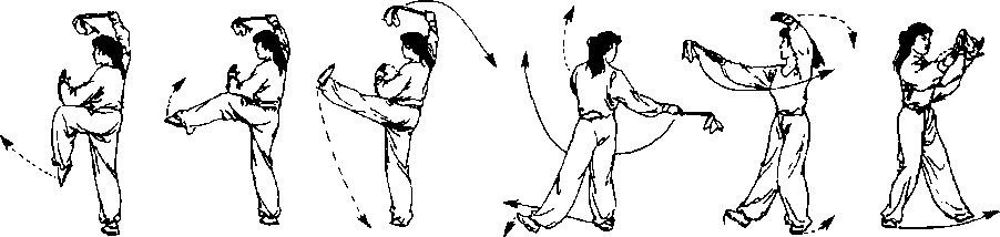 (6)左腿挺膝,脚尖勾起,脚跟向前上蹬出,脚高于胸,上肢动 作不变,目视前方(图3-43-35)。