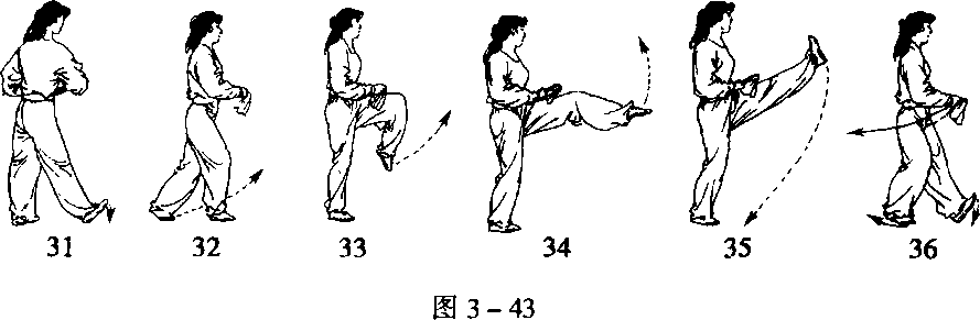 (7)左脚体前下落,脚跟着地,上肢动作不变(图3-43-36)。