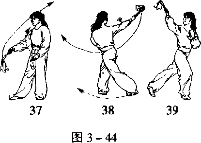 (8)左脚尖内扣,身体右后转 180。,重心移至左腿,右脚尖外摆 至右前45。处落地,同时两手随转 体向右后下方摆至体前,左手心 斜向下,右手心朝上,扇顶朝斜下 方(图 3-44-37)o