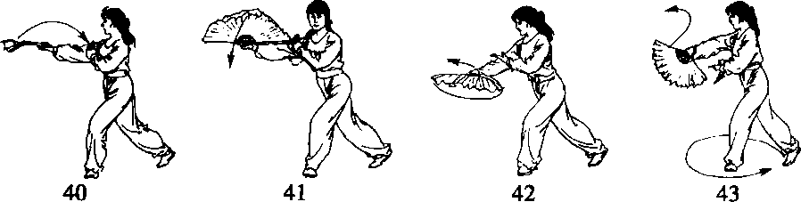 (2)右手腕上翘向里开扇,同时头向左转,目视前方(图3-45- 41)o