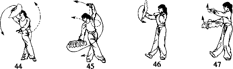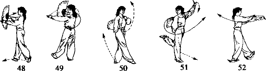 右脚尖外展45。落地,重心移至右腿,左脚跟抬起,同时两手以 腕为轴,由右向左在面前云转至左胸前,手心均朝右,扇顶朝左(云 扇时头略抬起)。眼随视两手(图3-47-48)。