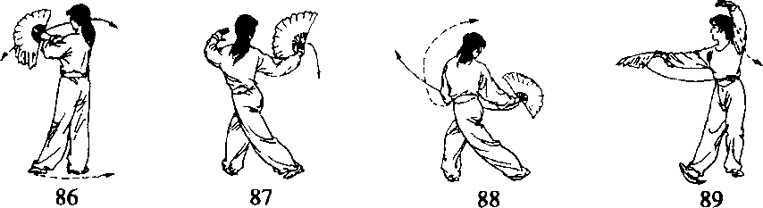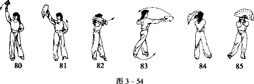 (5)右腿支撑微屈,左脚向右脚后侧插步,脚前掌着地。同时两 手心向外平行拉开,扇顶朝左,高于肩。目视右扇(图3-55-87)。