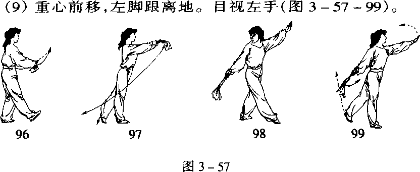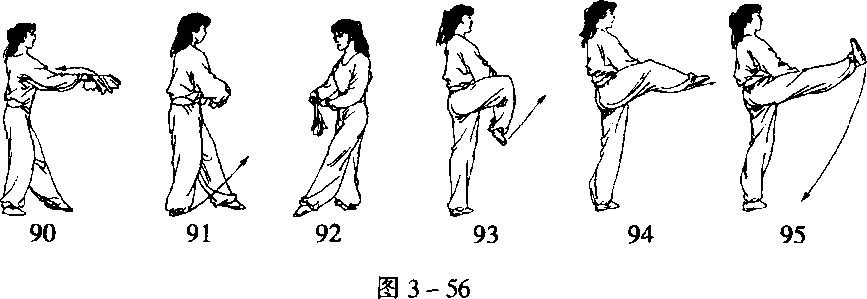 (3)重心前移,右腿屈膝提起,脚尖自然下垂(图3-56-93)。