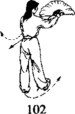 (1)左脚跟内拧成外展脚落地,身体左转45。;右脚向体前上 步,脚跟着地。同时右手腕内旋翻扇至脸前立扇,扇顶朝上,扇面 朝前略向前推;左手落于右胸前立掌,肘微屈。目视前方(图3 - 58 - 102.103)o